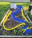 At the end of day 1, post planting, I checked the soil temp and EC readings. Soil temperature = 63 Fahrenheit at 7 p.m. EC reading = Range of 0.56 to 0.37 within 12 inches of the plant in all directions Outside temps hit 82 Fahrenheit in my backyard today. To help protect the pumpkin I rigged up a makeshift concoction of lawn chairs, plywood, and concrete edging blocks to help reduce stress on the pumpkin as it hardens of with wind and shade protection.