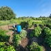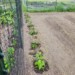 Beans and potatoes. I am trying green beans in the middle row and yellow beans on the right. I also planted beets and interplanted onions and basil. Along the back fence, I planted the adopted basil and hot peppers and leeks. Beyond in plot 145, I have cover crops growing containing buckwheat, mustard and alfalfa.