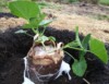 Another crazy idea! Grocery sack method: I put cardboard in the bottom, then I loaded this paper sack up with wet dirt. The plastic bags, doubled or tripled, are strong enough to pick this plant up. The paper sacks can be peeled away at planting time and the plastic slid out from under, with the cardboard helping. The paper sacks will be weak but they are supposed to act like a big peat pot and allow the roots to grow into a friendly barrier.