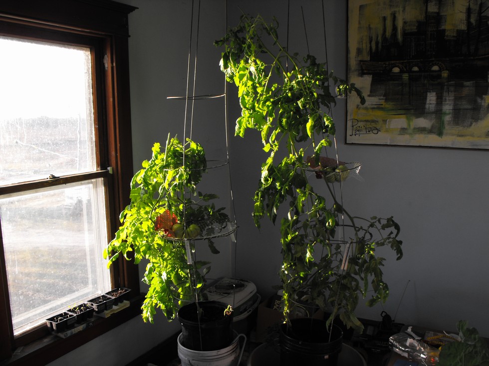 Thats a 64" window so the plants have gottin pretty good size since I've topped them off last week. I'm holding the camera up high to get most the plant in the pic. The tomatoes are doing good. I've moved them to the west window but they also still get south sun from the other two side by side 64" windows. 7.10 Foss Tomato plants and the 75.2 Thomas rutabagas in the window sills soakin up the sun.