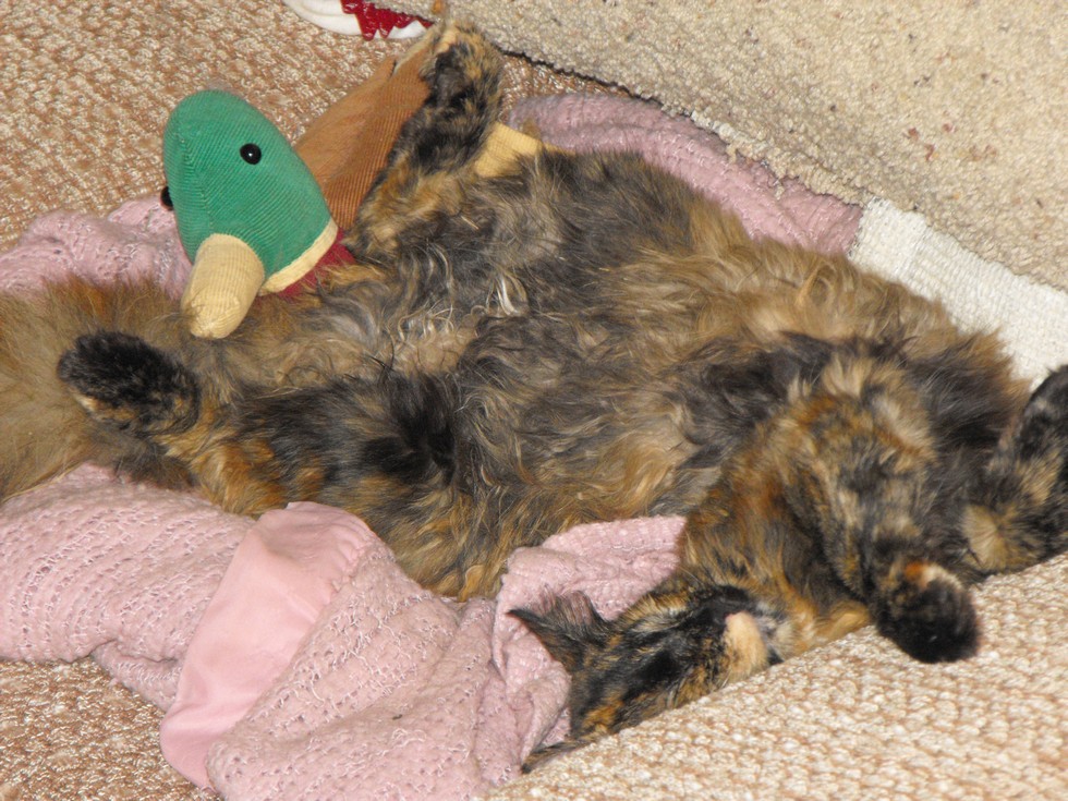 My daughters Tortiose Shell Maincoon cat. If you can't tell which ends which just go by the look on the ducks face,lol.