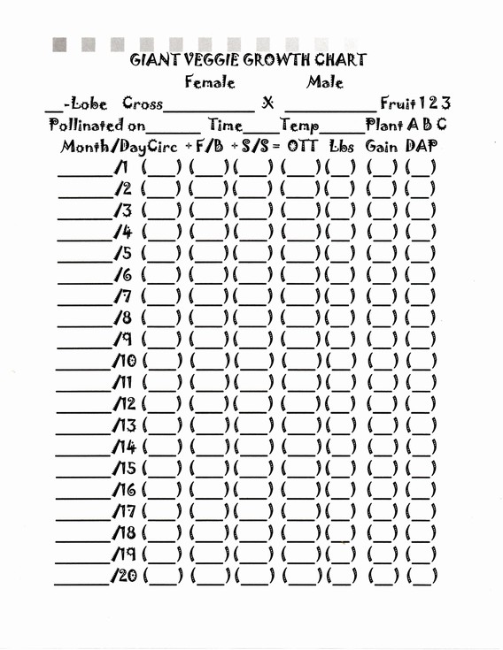 Here is a much better daily growth chart I've made up to use. I messed up the last one in many ways. This chart lets me depict which sibb plant is be measured by puting a circle around Plant A, B, C or D and lets you keep track easily of what kin your measuring by puting a circle around Fruit 1,2 or 3. What ever your growing. You can also read this one better beings it is darker Printed.