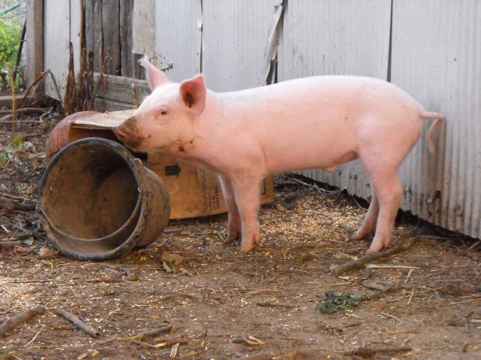 His favorite 3 toys, his old feed bucket, a box and his new basket ball. Amazing how pigs can toss almost anything into the air with their snouts.