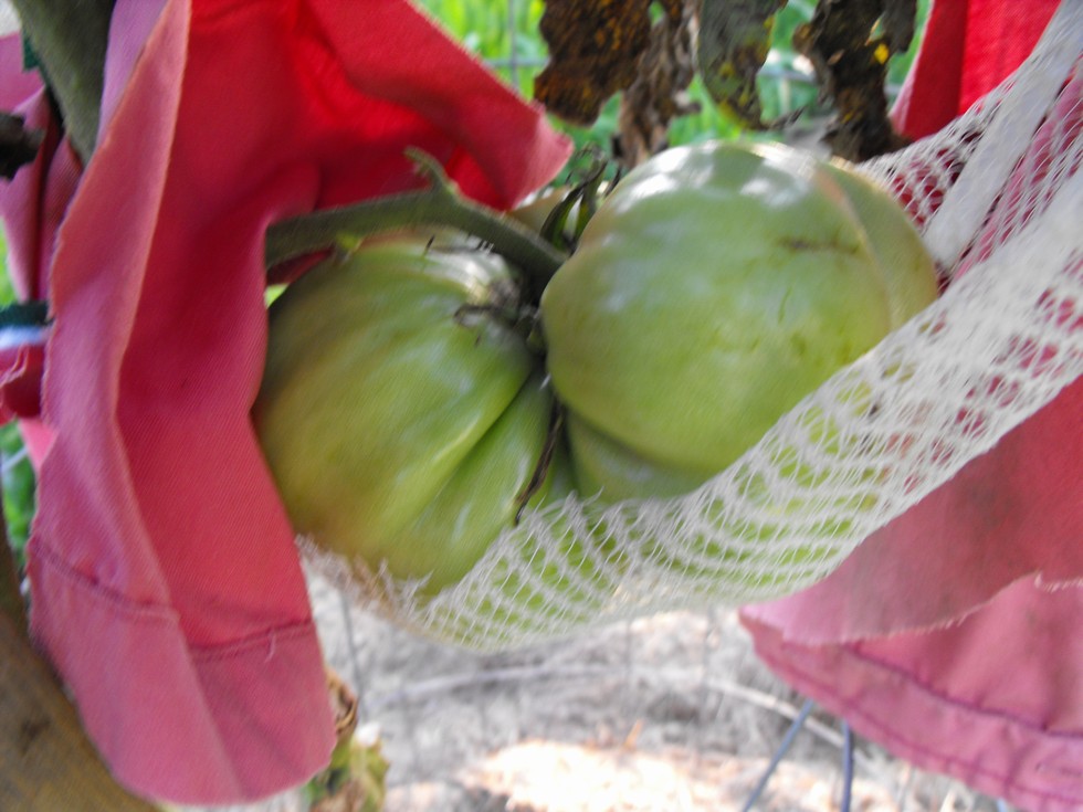 Heres a nice one on the 4.77 Hunt X 7.10 Foss (A)Plant. I use the 3" cotton draw string bags to keep them Isolated after pollinated but yet they can still get air and it helps keep the hot sun at bay. This tomato is growing at a pace twice as good as the 3.40 I weighed last week.