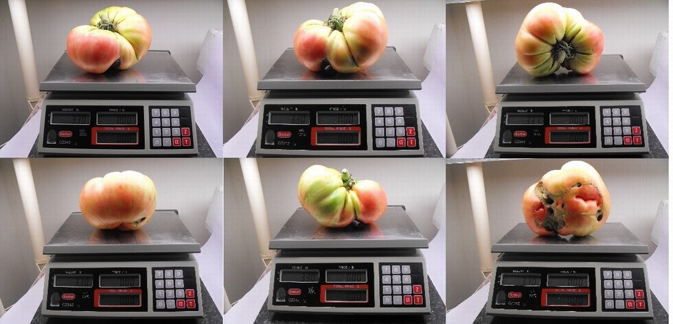 Tomato off the 4.2 Finder today 3.30 lbs. This is crossed with the 7.10 Foss. Nights in the 50's, days in the low-mid 90's brought this color on I believe. Will grow this seed and my 3.40 over the winter and next season. 3.40 UOW X 7.10 Foss.