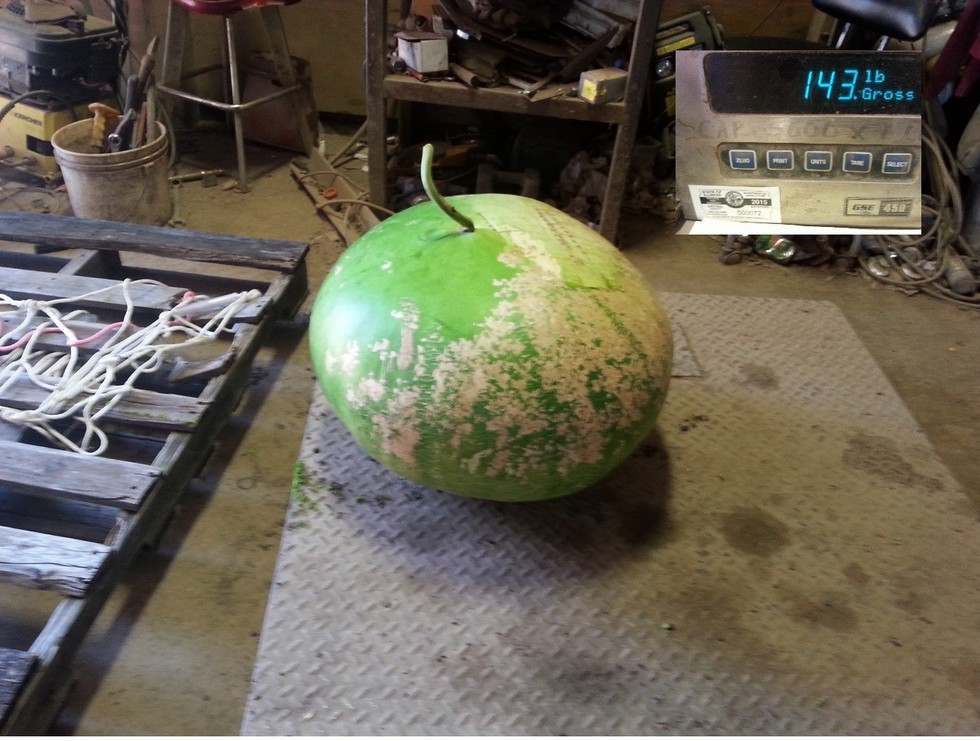 ****Correction****, this is the 130 Carey '14 UOW Bushel Gourd. Took it up to our local recycle center and got an Unofficial weight. It was impossible to measure in the patch being perched up on that Coke case. 143 lbs UOW and it was and still is solid as sears. Otis I guess its not too bad for my first year growing one of these crazy things, Learned a lot with yours and Chris Kents Help. Now the 143 J. Young UOW (130 Carey UOW X 279.5 English). Told you the Plant was big. This gourd was 68' out Half way down on the main out on the end of a secondary, Huge Plant with solid stump and roots still but only about 30 leaves....one word..WEEDS!!