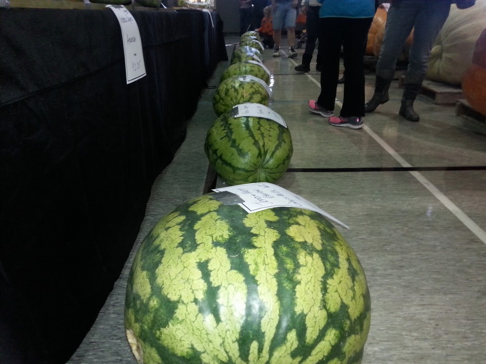 Here is another pic of the damaged Melon that was allowed at Anamosa yesterday. Closes melon in pic bottom left side in pic. I didn't even know I got a pic of it until it was pointed out to me by a couple other growers while I was taking it. Then I took a close up pic, (earlier post). The site judge was clearly upset with me for bringing up this issue and I went to apologize to him later on but I got a dirty look and he turned and walked off,lol. OOPS..I need to learn my place at these events I guess because when it came time to load up my melons I was ignored and received no help from any of the guys helping others load they all ignored me,lol. An awesome first time grower from Iowa helped me load up and I greatly appreciated the Help!! Still had a good time beside the hick up!!