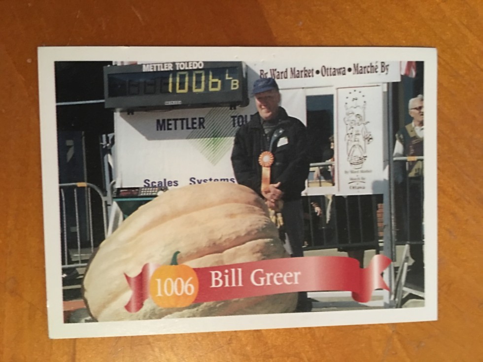 BILL GREER CARD FRONT. We met Bill at Nuttree in California in 1996 where his WR PUMPKIN was on display. He held the WR (1006 lbs) for just a day or two before the Zehrs broke the record with a 1061. The 1006 and 1061 were the first pumpkins over 1000 lbs.