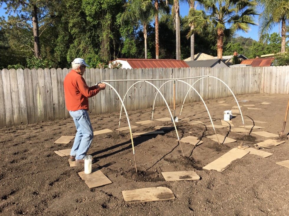 It is greenhouse day! First the frame work goes up. We make our houses 10 ft x 7 ft. Rebar, pvc pipe, duct tape, clips, zip ties......patience?
