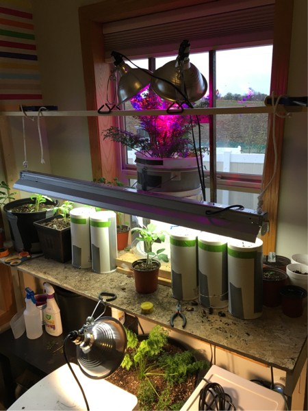 Here's all my children - it's amazing the difference in the carrots - planted the same time, fertilized the same, watered the same and the same soil - the carrot up top with the pink lights is about 3 times the size of the carrot on the floor on the bottom of the picture - also a couple maters in there the 6.83 fulk and the 7.10 Foss