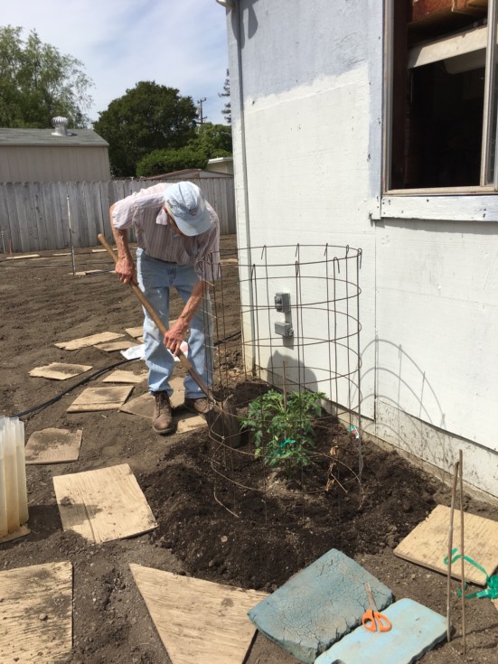 Remember that little tomato plant in the wall o water? Well, it outgrew the wall o water so we took it out and staked her up, added a wind barrier (not in the photo) and we are off to the races! The plant already has some blooms on it! We will be taking our other tomato and our cuc out of their wall o waters in the next couple of days. Time to watch some basketball and RELAX! And WATCH the pumpkin pots pop....