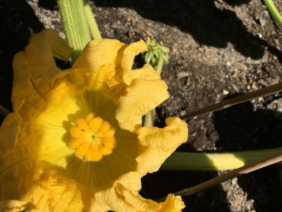 Here is a pic of our first female we pollinated today. It is on the 1998 Jutras.It is a six lober. Not perfect but not bad either.There is another one about 3 ft further out. We used 5 males from the 2230 Wallace to pollinate. I think this combo should be called a WALRUS! LOL! I was planning on calling her Sue but Walrus could work! Someone (was it Patty Hawkley?)in our travels this weekend suggested we take pics of our blossoms before pollinating and then compare to the final shape of the pumpkin. We are going to TRY and do this as it could be interesting. Good luck to the Walrus! Okay! Time for the WARRIORS!