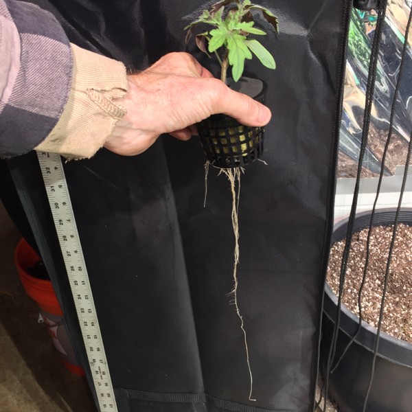 The three inch net pots are working. I am going to start to study the early growth characterics of the plants. Using these three inch pots should be able to start many plants in a small area. If I can learn to read the characteristics that lead to better full size plants it will possible to cross a plant and then grow out to first evaluation stage without having to dedicate full size greenhouse. Root formation is one quality that can be evaluated. This 3.37 Rakkas has 18 inches of root for 3 inches above ground. This is double the root length of the other two. The one Rakkas seed I tried before was great fun. This one is looking just as fun. It is variety unknown.