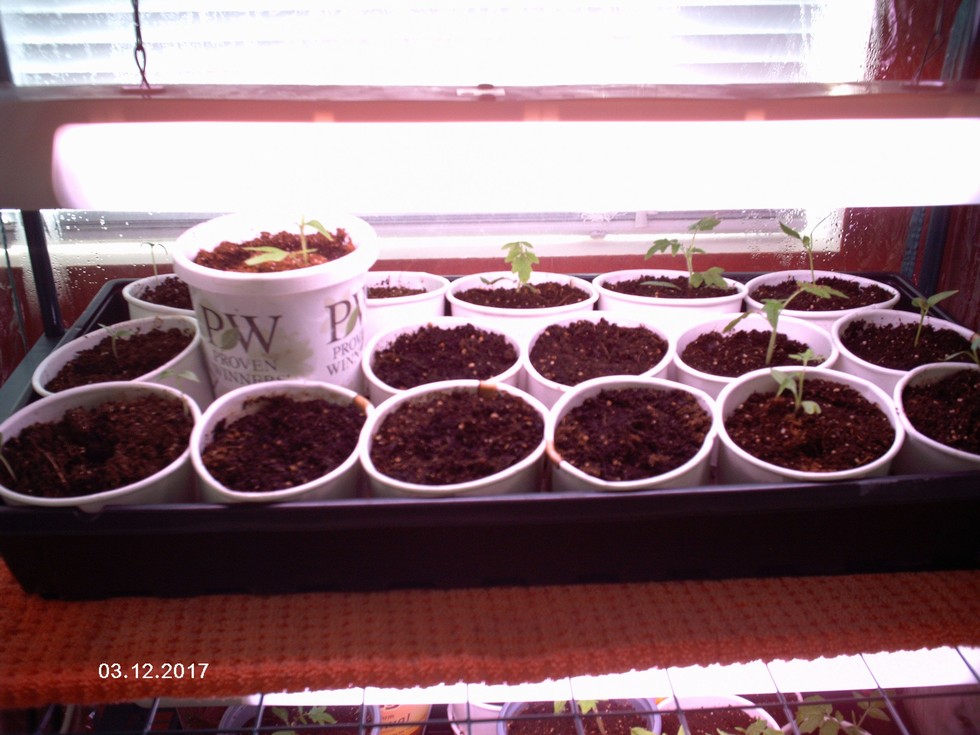 The weather is cold at 20 degrees F with a wind very light at 4 mph!! Snow comes tonight with 1-3 inches possible! Update on progress: Tray is showing now 3 World Record Strain Giant Bell Pepper seedlings from 550g Nieuwenhoff since I allowed the soil to dry out and one of the seedlings died. In the middle, I had planted six Ghost Pepper seeds from Oglesby 2016 (5 of 6 have died). I tried planting this weekend new Carolina Repear seeds in new pots, but whoever donated those to the Exotic seed exchange never included more than a name of the seed. The grower's name and year grown were missing from the package! The two cups with all four Trinidad Scorpion Morouga Yellow peppers from Garofano 2016 are doing very well.