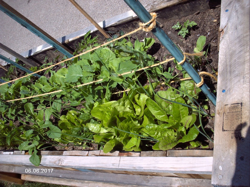 Backyard grow box showing space saver watermelon, peas, tomatoes, Spanish onions, arugula, Swiss chard, french radishes, giant Caesar lettuce and baby Romain lettuce.
