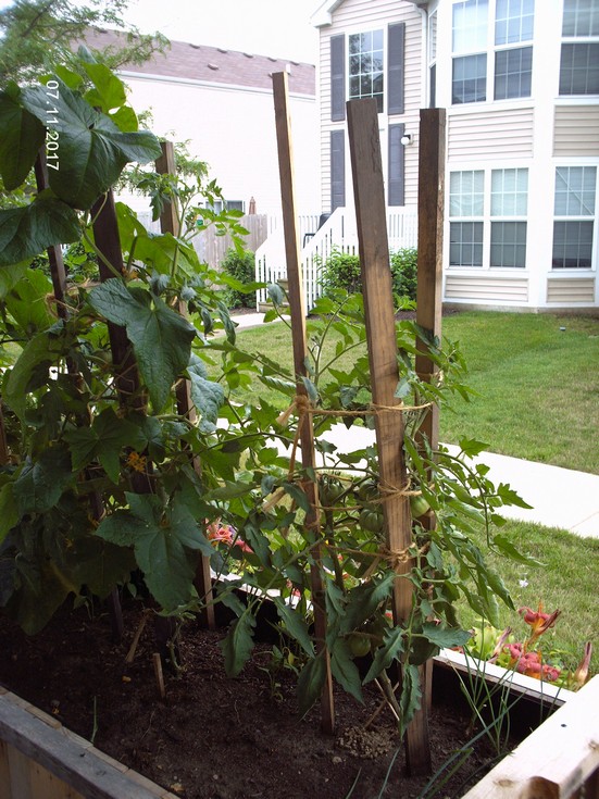 Flat bush beef tomato next to the space master cuke. Nice tomatoes formed!