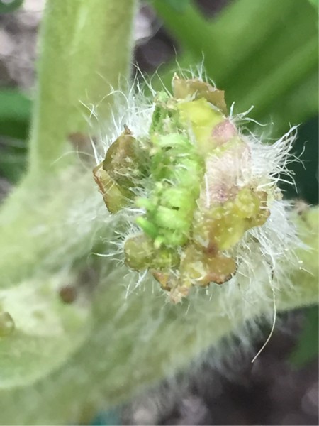 Right or wrong I made my pruning decision on the ribboned 8.61 Sutherland. This blossom was right in the middle of 6 to 7 fused vines. Thru the past few days I have been snipping the vines off to give the blossom some place to grow. If the blossom can develop now and set it will have a huge hose to feed it. All new growth is now terminated. If it doesn't set, I will let the plant go without pruning to see if it can put out some seeds. At this point it is in the time window when it could be a fall weighoff contender.