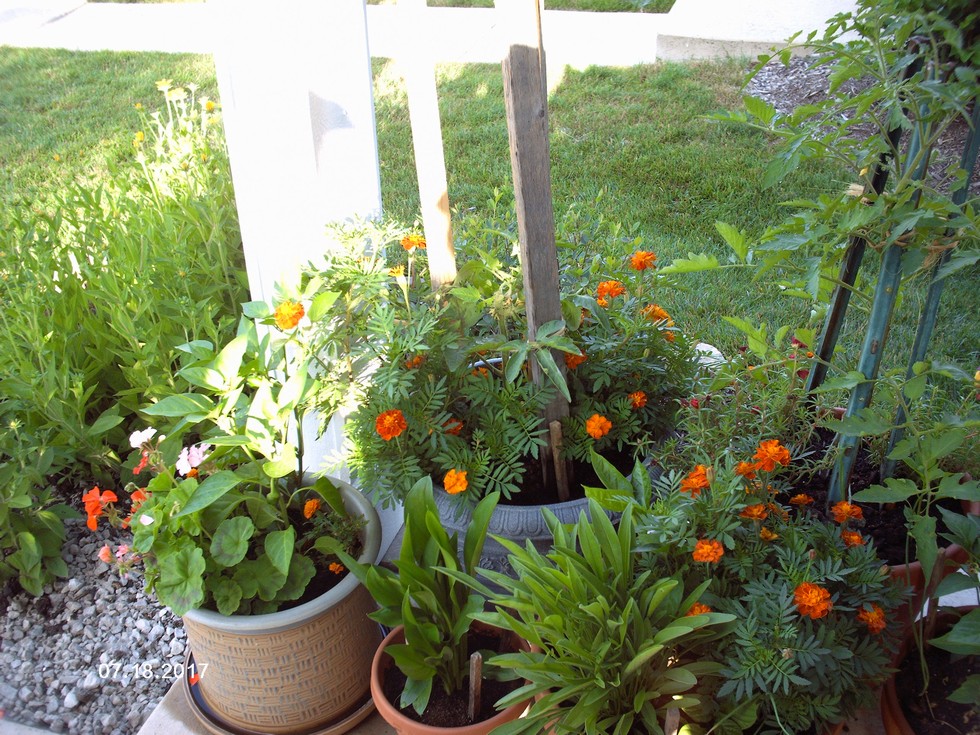 Paint Box Geraniums, marigolds, Yellow Coreopsis and Cana Lilly.