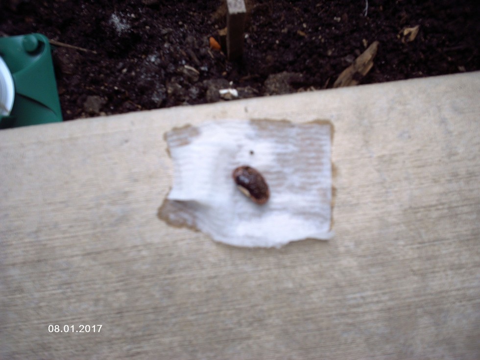 Thanks to my friend the resident chipmunk, I had to replant a second scarlet runner bean. I also found out she hates cayenne pepper which I applied everywhere I planted seeds. BAD, CRAZY RODENT!! May she have a burning HOT breath!! Anyway, I soaked this seed 4 hours, wrapped in a small square of paper towel and placed in a tiny closed plastic bag used for seed saving. The skin should look a little wrinkled.