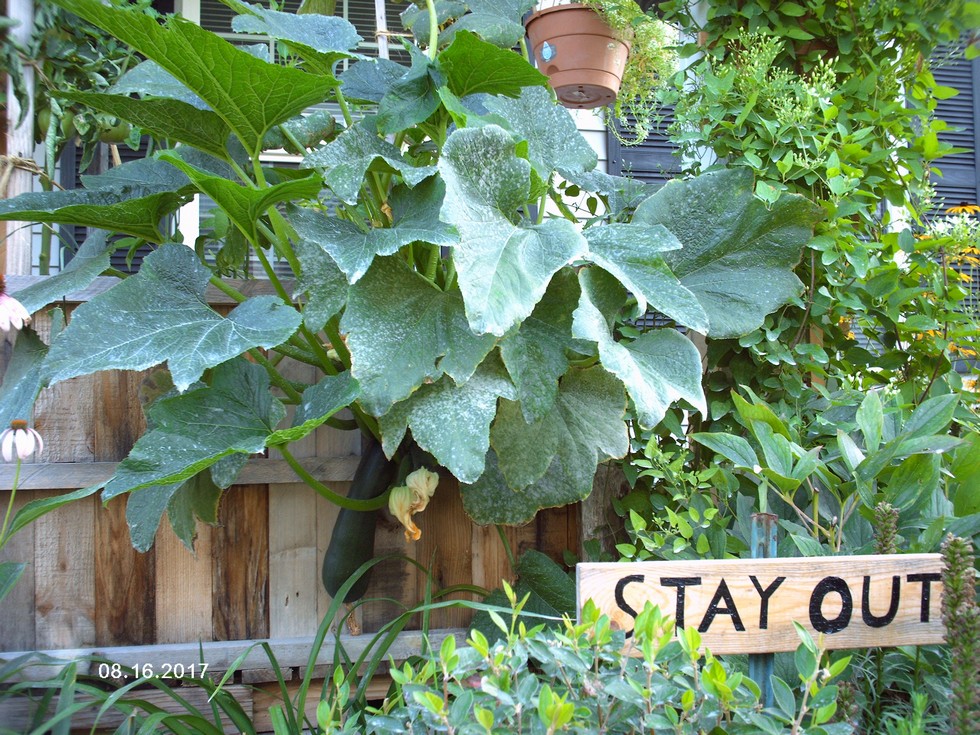 More hanging out with the zucchini! As for the sign, I sometimes have young hands in my neighborhood pulling up plants or picking flowers and leaving them for dead. I have found that they appreciated gardening more this year when I spent time having each child prepare the soil, plant seedlings, water and feed. They were reminding each other not to pull up the plants as time passed and are sometimes wowed by how big the plants can get and the veggies or flowers produced. In the photo, I have been challenged with mildews on my space saver zuke. Great plant, but the cool nights are reeking havoc. I continue to lightly water only at the base and only in the morning. Bonide Fungonil is great product which you might want to give a try. Please only apply during times of no direct sunlight and follow the directions!