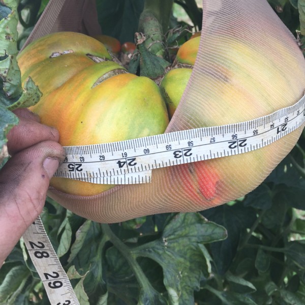 Tomorrow is the big day. I will finally get to see if i am a member of the 4 pound Hunt Delicious club. Best measurement tonight on vine is 23.5x19.25x18.25 = 8255. M-factor of .00046 (my best so far this year) gives est weight of 3.63 lbs. M-factor of .00055 ( Biscuits suggested factor) gives est weight of 4.54 pounds. M-factor of .00062 (the number Biscuit is actually getting) gives the est weight of 5.11 My coworkers are ready to be good tomato judges. Has anyone else ever had someone try measure their stem with a caliper to make sure it is not too long? This tomato might be mutilated by the time they are done as they probe crevices looking for soft spots. It is going to be fun.