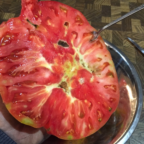 Since today is a seed harvesting day for me, I thought I would show the new growers how I do it. It is my 3.78 that I am getting seeds for next year. I start by slicing the tomato in half and scooping all the seed pockets with a little spoon into a bowl.