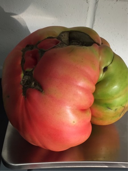 Change of plans..with a forecast tonight of chance of freezing I picked all my remaining tomatoes. Overall the results were disappointing but I saved what I thought was the best one for last. Sigh of relief, it might be competitive. I will be planting seed from this tomato. It was grown in a 40 gallon pot on a shady deck. It is a BigZac that showed mega-cross level blight resistance and off the vine it has my personal best multiplication factor of .00058 . Hope it doesn't lose too much weight in the next 5 days...Stillwater here we come...
