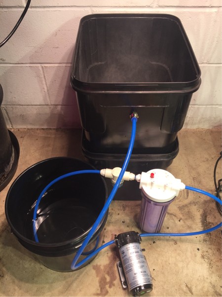 Step one of setup is complete. I have mist. I have calculated that only one nozzle can be used in this size container based on the flow rate of the mister and the shortest on cycle from my timer which is one second. With only one nozzle I am worried that a clog will kill the plant so the intake is being pulled thru a 5 micron filter by a 100 psi pump. Next up...timing the mist.