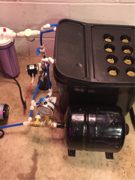 It is an advantage to be flexible with plans when trying something new. I could not decide which seedlings to move to the aeroponic setup so I moved them all to this 8 gallon bucket. For now I am recirculating the solution. I am thinking that a seedling is not going to use enough nutrients to upset the balance. I am not liking the 1 nozzle setup..it seems to me that the mist dissipates too fast and does not reach all sections of the bucket. I raised the time to 10 seconds on, 1 minute off to try to compensate. Hoping the seedlings will survive until next weekend when I can make more modifications. Parts are on order.