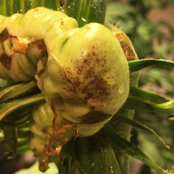 The hydro plants got very stressed last night. Roots had grown into the 3/4 inch return lines and blocked them. The recirculating pump kept pumping until it over filled the buckets and ran out the top. I did not notice until this morning. Glad I have a floor drain. The bucket with my super mega was hit worst. It was almost empty. I have moved the plant to a bucket by itself. I am waiting for the grow store to open..i am out of PH up to mix a new batch of solution. Unfortunately I am seeing brown specks on the fruit. From past experience this will turn into BER if left alone. I am spraying calcium chloride on the fruit and nearby foliage. I give about 50% chance of saving this set. Even with the trauma it still grew 1/4 inch or more on each end..over 4 inches long now. Should know in a few days if BER will take it down.