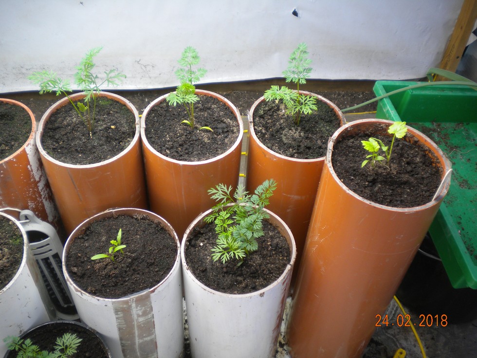 Carrots and Parsnips now transplanted into my short two part pipes, growing under a T5 light.
