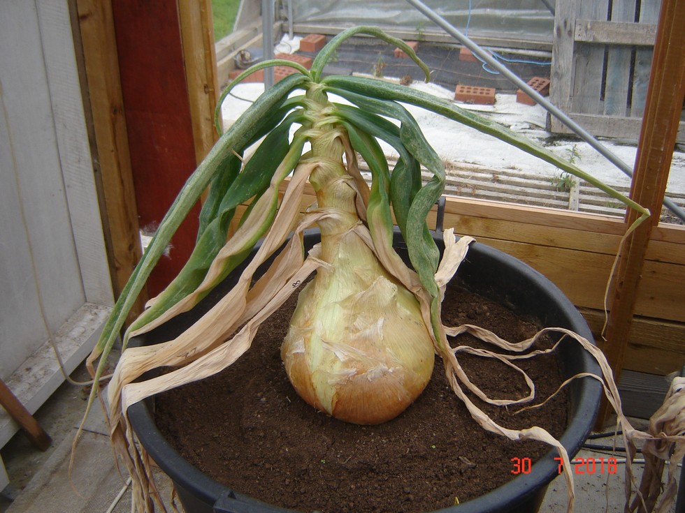 Heat continues, Onion tops withering away. This one is in soil based compost.