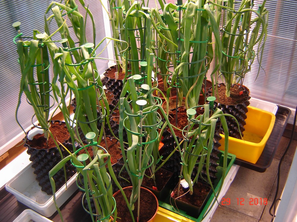 Largest onions now in up to 10 litre air pots and standing in a higher greenhouse enclosure under hp Sodium lighting.