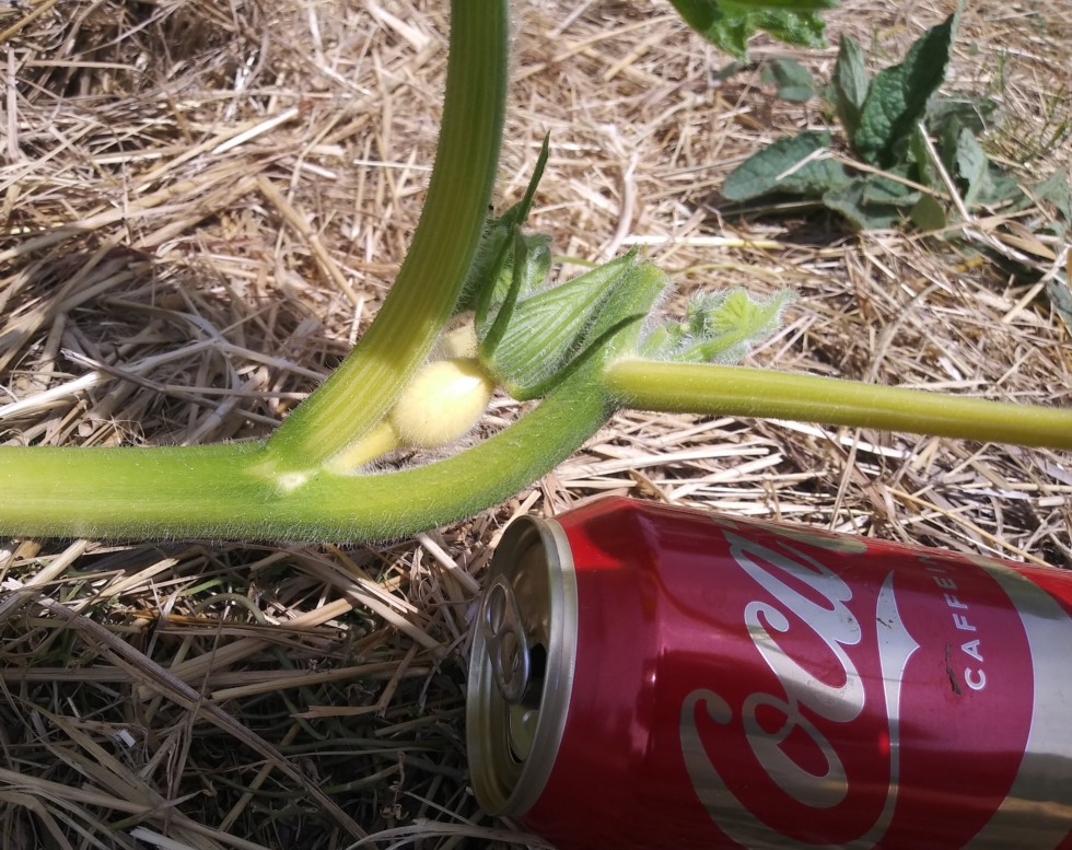 Pumpkin #2 a little behind the other. Vine bent in towards the pumpkin... This is because I forgot about cutting the tendril. So there will be no "keeping one secondary past the pumpkin" here. I might also prune off the secondary at the pumpkin as an experiment.
