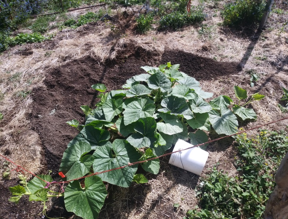 186 Radach is back to being the star of this show. I might try the impossible... A main vine set, close in to the stump, blossom down. A major pain---but woulld be worth it if it worked. I have aligned the plants at 120 degrees (1/3 third for each) so the vines can all have their own space, for now. Not worried about a few leaves overlapping.