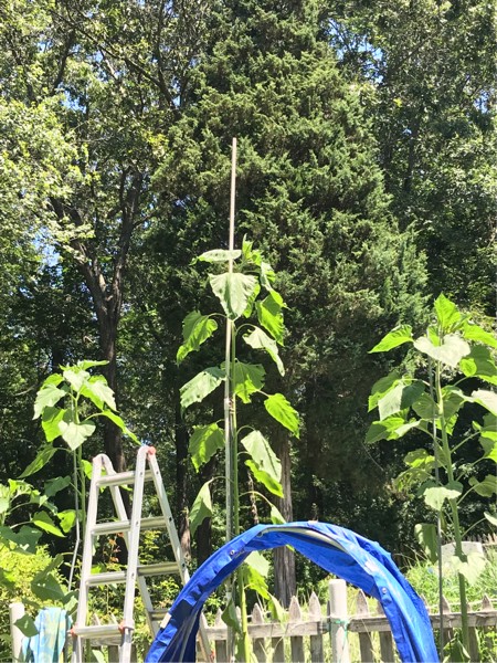 Added extra support for my giant sunflower. She�s heading but the head is still far in there. Hopefully I can get her to the top! Going to be close.