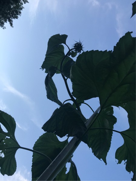 Giant sunflower still bent. I need to figure out a way to straighten her out. Can�t have her looking like that for the fair.