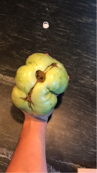 First Giant tomato of the season off the 6.06 Schmit. Thanks Mike for the seed! Will weigh her on Saturday. Circumference of 18 inches. Picked her a bit early since the stem was in rough shape. She was a bit red