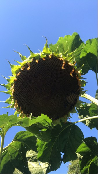 Giant sunflower head. Gotta cover the head. Birds taking the seeds.