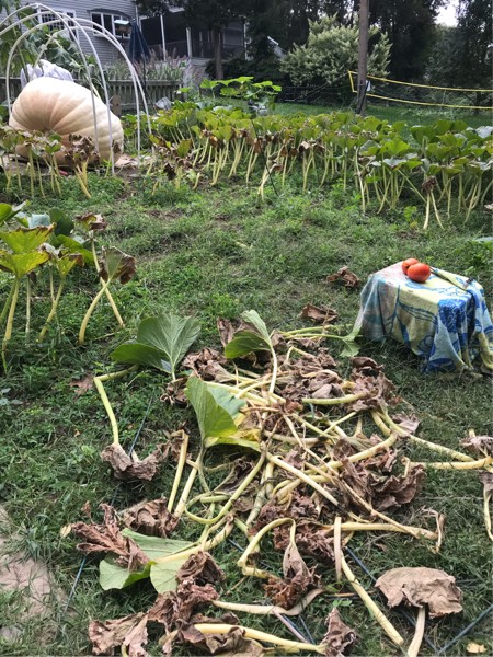 Something is going on with my plants. Especially on the 1928. For the last 3 weeks I�ve been losing leaves left and right! I feel like I�m cutting off 20-30 leaves a day! The stalks get all soft and flexible. It�s nasty. Gummy stem maybe? I really hope the pumpkins aren�t rotten inside! I won�t have any plant left in a week.