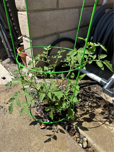 Henry, the crack tomato plant is doing great! If you look close, you can see that he's now bearing some fruit. It looks to be a cherry tomato variety, but the jury is still out.