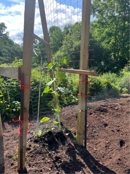 I even planted a solo cup pumpkin plant that I started last week to see if I can get a sellable pumpkin come fall. I even have a bushel gourd in and I built a half ass long gourd trellis yesterday. I had put a long gourd in the patch next to a cage and it was ready to go over the top so my carpentry skills were tested. I hope a strong wind doesn't blow it over. I am not much of a builder.