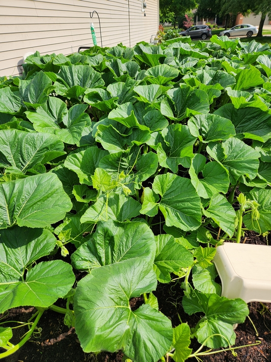 The 150 sf bed is full at this point. If I'm blessed with a pumpkin, I will need to cut a secondary or two so there's more room for growing the fruit.
