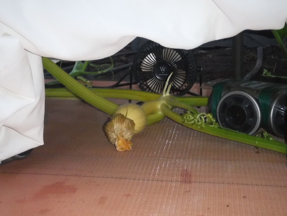 The pumpkin at this stage seems to be made of "hot butter" so it is very susceptible to physical damage which is why the goal is to not come in contact with it unless it is absolutely necessary. A helping hand to push the plywood and mill fabric combination is welcomed as there is a lot to keep track of to prevent unwanted damage. Even though the pumpkin can still abort, it is slowly growing, but the key is that it still has its youthful shine to the skin. The back-up flower will still be pollinated just in case, but hopefully this is the one that will be the final "keeper".