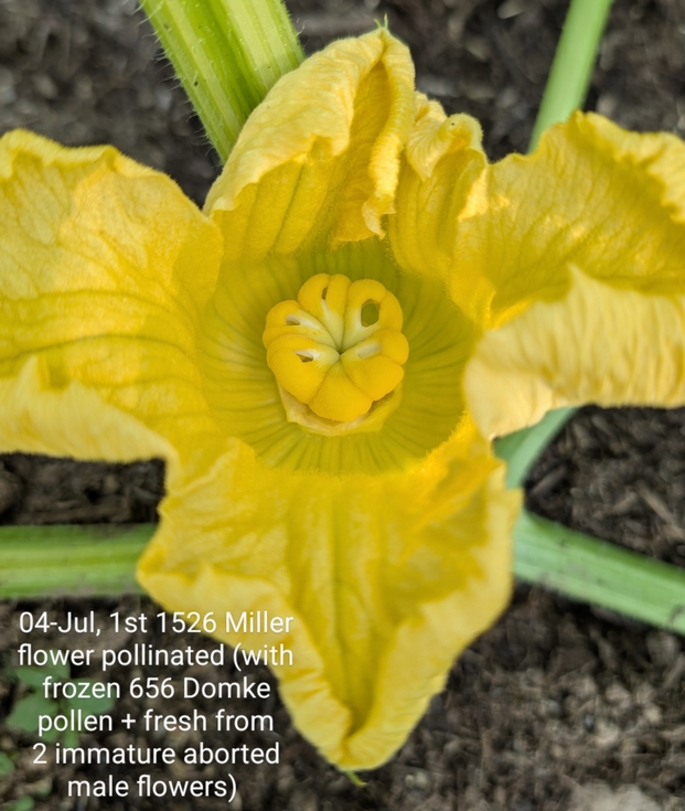 On July 4th I finally had a 1526 Miller flower to pollinate. Nice looking flower with 6-lobed stigma. Used 656 Domke pollen, some of which was frozen a week or two prior, and some of which came from two fresh but either immature or aborted male flowers (all that I had access to that day).