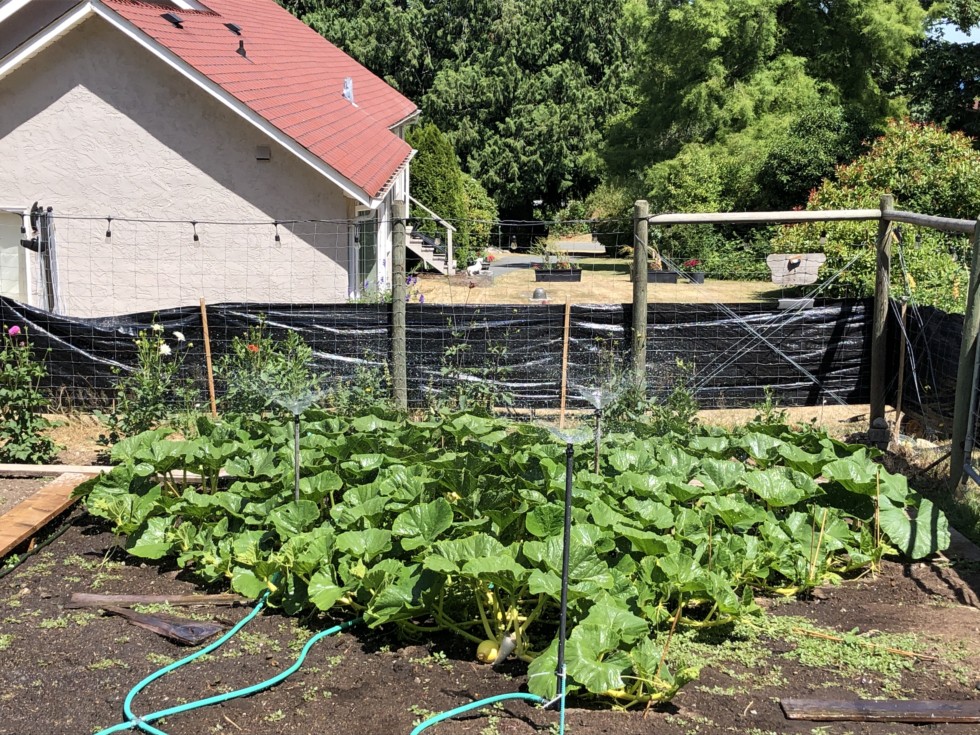 The prizewinner plant (395 Dixon 2021 PW) is getting a drink from the 570 Toro shrub sprinklers that Vince Z uses and told me about 15 years ago. I can run 3 of them linked together using the 1.6 HP sprinkler pump connected to our tank. I've never grown anything in this corner of the garden, it's right behind our large gate.