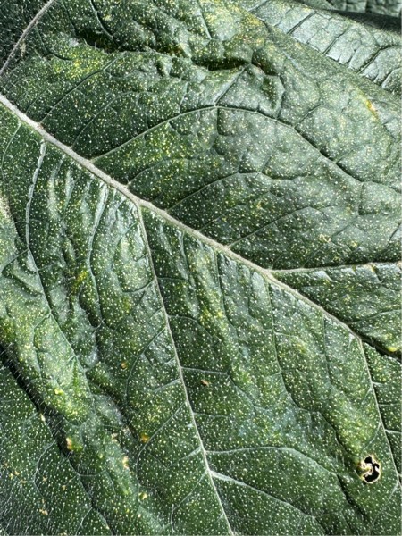 Every year I have to deal with spider mites. For such little guys they do a lot of damage. I've just read that high nitrogen is attractive to mites so it's no wonder they are here early. This photo shows the top of a leaf infested with them. Those white dots are a tell tale sign. I've treated the plant with Avid three times over the past nine days. This is the only way to interrupt their life cycle. Fortunately, I caught this early and only a couple of leaves got infested.