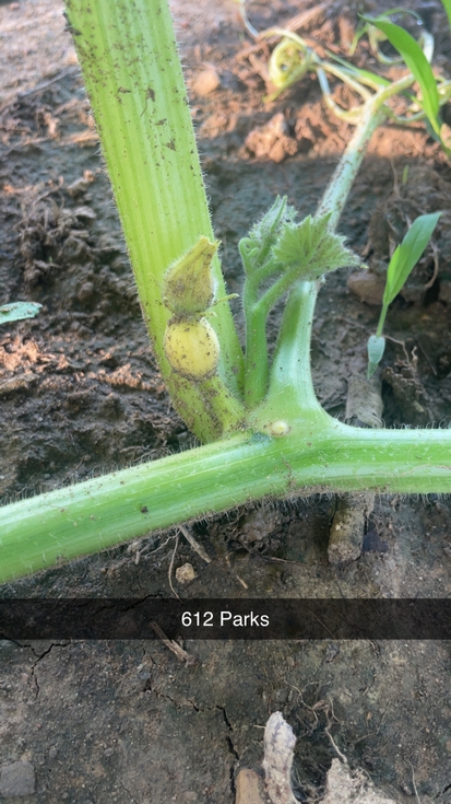 612 Parks is 2 months old and I now have a few pumpkins coming in. I have 3 months to my deadline. This one is not in the best spot but I have another coming in on a secondary vine. I'll take whatever I can get.