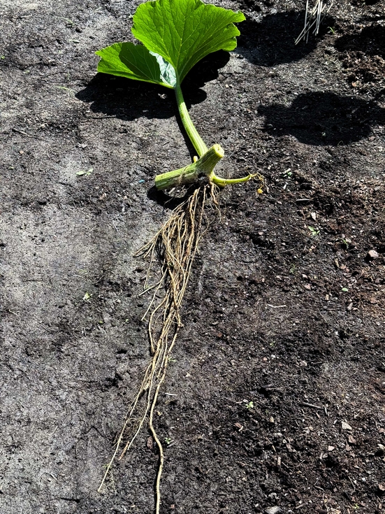 In an attempt to prevent further spread and hopefully keep a pumpkin on a secondary, I cut off the end of the main and several secondaries closest to the fruit. Unfortunately, if there is disease you have to be fairly aggressive and cut off more than you would like. This is a pic of the roots I pulled up from the end of the main vine.
