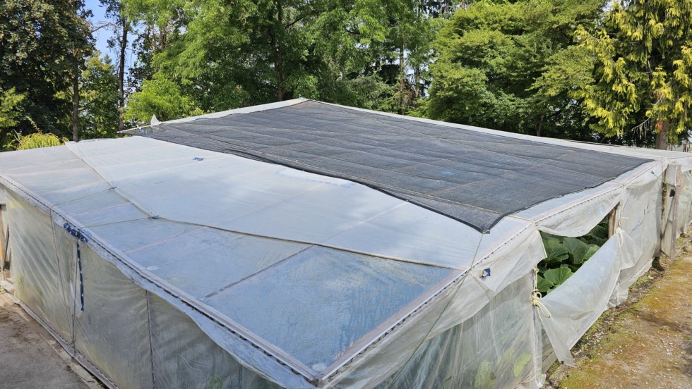 The greenhouse got very hot when the sun was shining. Even misters running wouldn't cool it down and often (almost every day) it would get over 100 f . I bought some 50% shade cloth to try as I had no experience with it. This one piece, 20' x 30' has reduced the temperatures into the 80's and low 90's. And that's with the misters off. The next day both pumpkins in the green house put on a few pounds more than average. Time will tell and I measure every day to see the effects of everything I do to the greenhouse and plants.